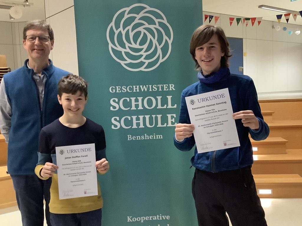 Sie tüftelten vor den Herbstferien in der ersten Runde der Olympiade in einem Hausaufgabenwettbewerb erfolgreich an vier Aufgaben und erreichten dadurch die zweite Runde. Diese bestand aus einer vierstündigen Klausur, bei der wieder vier Aufgaben bearbeitet werden mussten. Beide haben gute Ergebnisse erzielt, aber leider hat es nicht zum Erreichen der dritten Runde (Hessische Endrunde der etwa 20 Besten) gelangt. Aber: „nach dem Wettbewerb“ ist „vor dem Wettbewerb“, Jonas und Konstantin werden es im kommenden Schuljahr wieder versuchen.