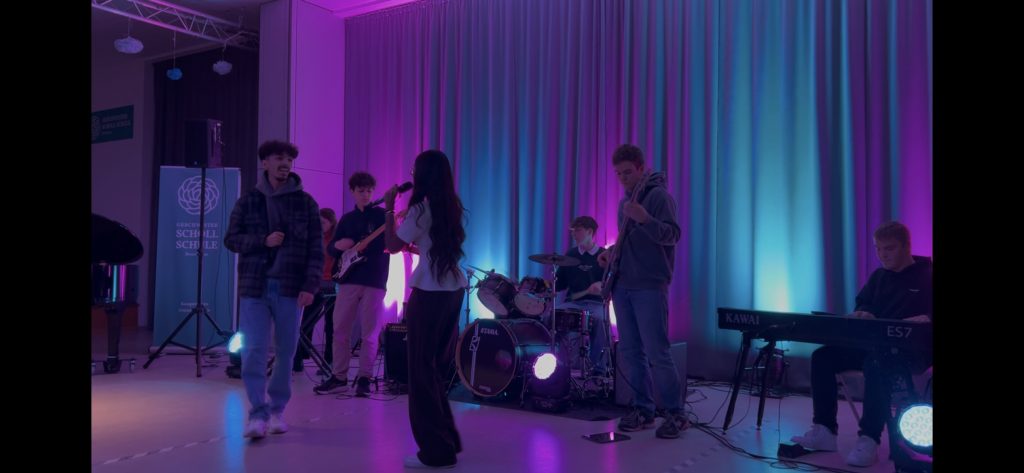 Den musikalischen Abschluss gestaltete die erfolgreiche Schulband „2B“, die mit viel Energie und Spielfreude die Aula noch einmal zum Beben brachte. Für die besondere Atmosphäre sorgte zudem Philipp Klein, der die Veranstaltung mit einer ausgefallenen und technisch innovativen Lichtshow veredelte.