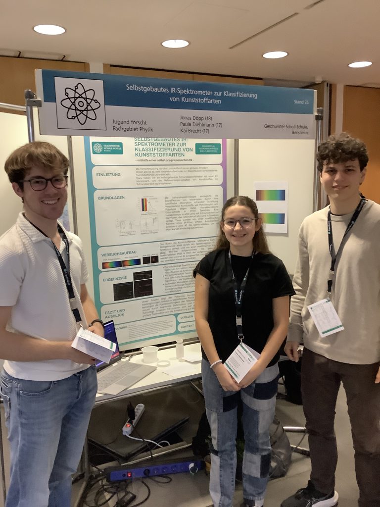 Beim Regionalwettbewerb von „Jugend forscht“ in Darmstadt am Donnerstag, dem 12. Februar, stellten Paula, Jonas und Kai (alle Q2) ihr Projekt „Selbstgebautes IR-Spektrometer zur Identifikation von Kunststoffarten mithilfe einer selbst entwickelten KI“ vor.